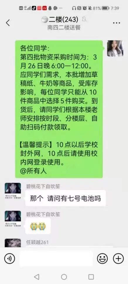 意识到情况的紧急,她立刻下床随意套件衣服后,便冲出屋子开始一间一间敲起学院寝室的门,把同学们喊醒后,她耐心说明情况、安抚大家忐忑的心理。在她和同学们的共同努力下,不到1小时的时间,南四便组建了150多人的哲社志愿者服务群。李慧婷也开始全面负责起了住在南四的19、20、21三个年级志愿者们的所有工作,扛起了这面大旗。“我们哲社巾帼,时刻准备出战”,她说。