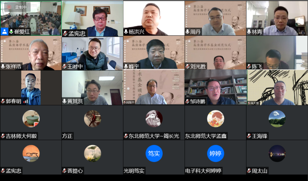 高清海先生是当代中国著名哲学家、教育家。先生一生爱智求真,为繁荣和发展我国的哲学事业做出了重要贡献。2017年,为了传承高清海哲学思想,弘扬高清海哲学创新精神,推进哲学基础理论研究,国内学术界同仁、广大系友和高清海弟子发起并捐资筹建了“高清海学术基金”。基金面向全国哲学界,奖励高清海哲学思想研究和外译的优秀成果以及哲学基础理论研究的优秀创新性成果。今年是第二次评奖,来自东南大学、中国人民大学、南开大学、吉林大学、复旦大学、中国社会科学院哲学研究所、中国孔子研究院等高校和研究院所的十二名学者获得奖励。在颁奖仪式上,崔月琴教授宣布了第二届高清海学术基金奖获奖者名单,UG环球360官方网站院长田毅鹏教授为大会致辞。东南大学张祥浩教授、中国人民大学臧峰宇教授和中国社会科学院周丹研究员在线上代表获奖者先后发言。