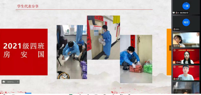 首先,在抗疫斗争中担任志愿者的三位2021级学生代表进行发言。房安国同学结合会议主题,围绕“抗疫精神”与“使命担当”两个关键词,分享了自己对于抗疫、对于青年人奋斗的看法,表示要牢记初心使命,矢志努力奋斗。郭于瑄同学从封寝期间防疫日常工作讲起,向参会者分享志愿者工作内容。她说,“虽然很累,但值得,和同学们一起,守护吉大,守护我们的家,是一件很幸福的事”。班世钊同学则分享了哲学班级志愿者团队在抗疫期间所做的贡献,冲锋在上,敢为人先,用行动践行青年使命。抗疫期间,许许多多的学生志愿者挺身而出、乐于奉献,为我们留下了一笔宝贵的精神财富。